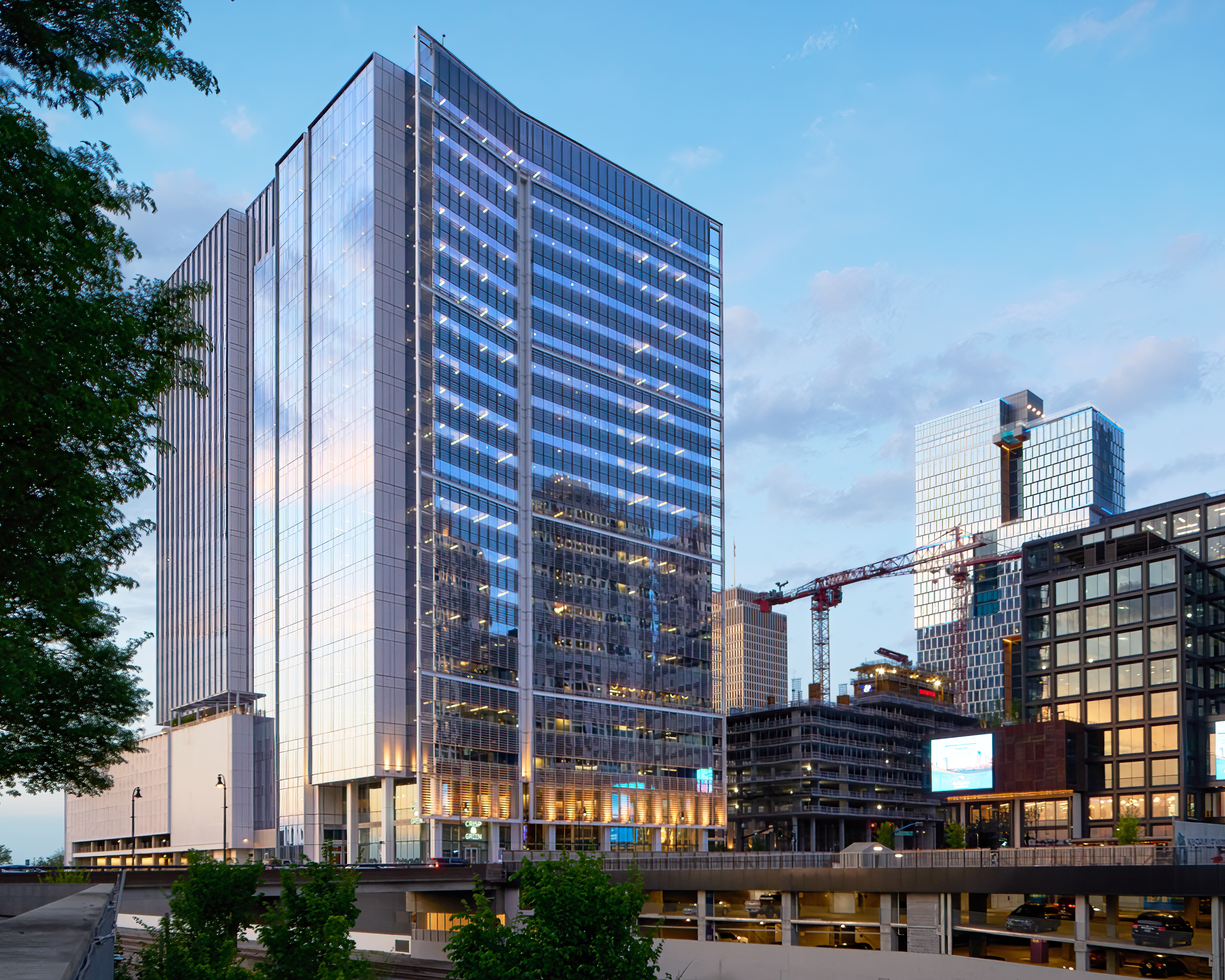 Most new office construction in the Southeast follows a rigid right-angle logic. The east Amazon tower does not. Its south corner is treated as a soft, continuous curve that runs the full height of the building. From the Demonbreun Street bridge, the curve reads as a single sweep of glass that catches the sky and throws it back in a way flat facades cannot.