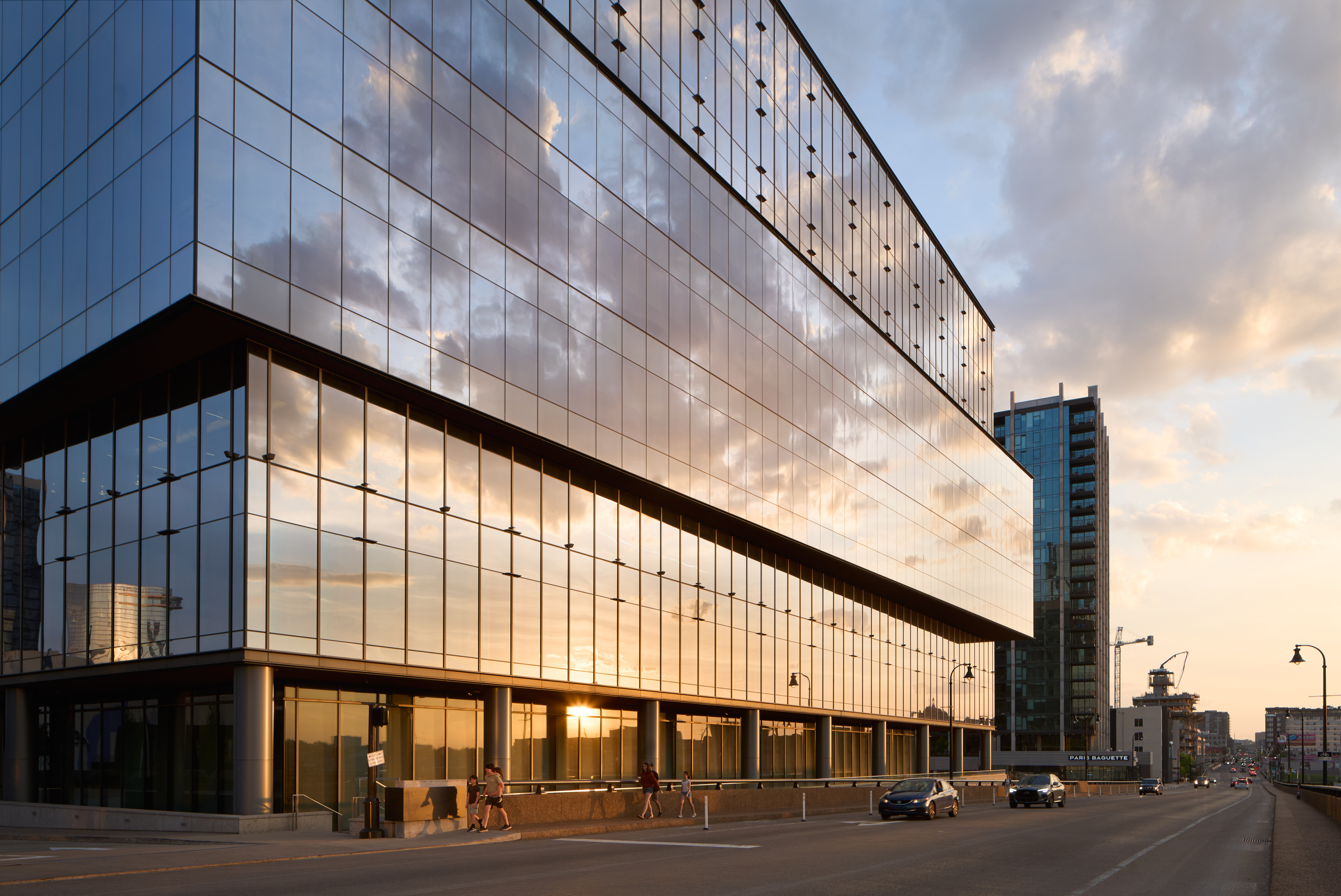The mirror glass on the Asurion building is the facade's defining feature. On a clear late-afternoon sky, the reflective surface pulls in the clouds, the neighboring towers of the Gulch, and the Pinnacle and Grand Hyatt across the rail yard, and compresses them into a single composition on the building's face. The reflections distort and stretch as the facade planes shift, creating an almost liquid quality.